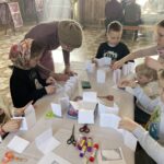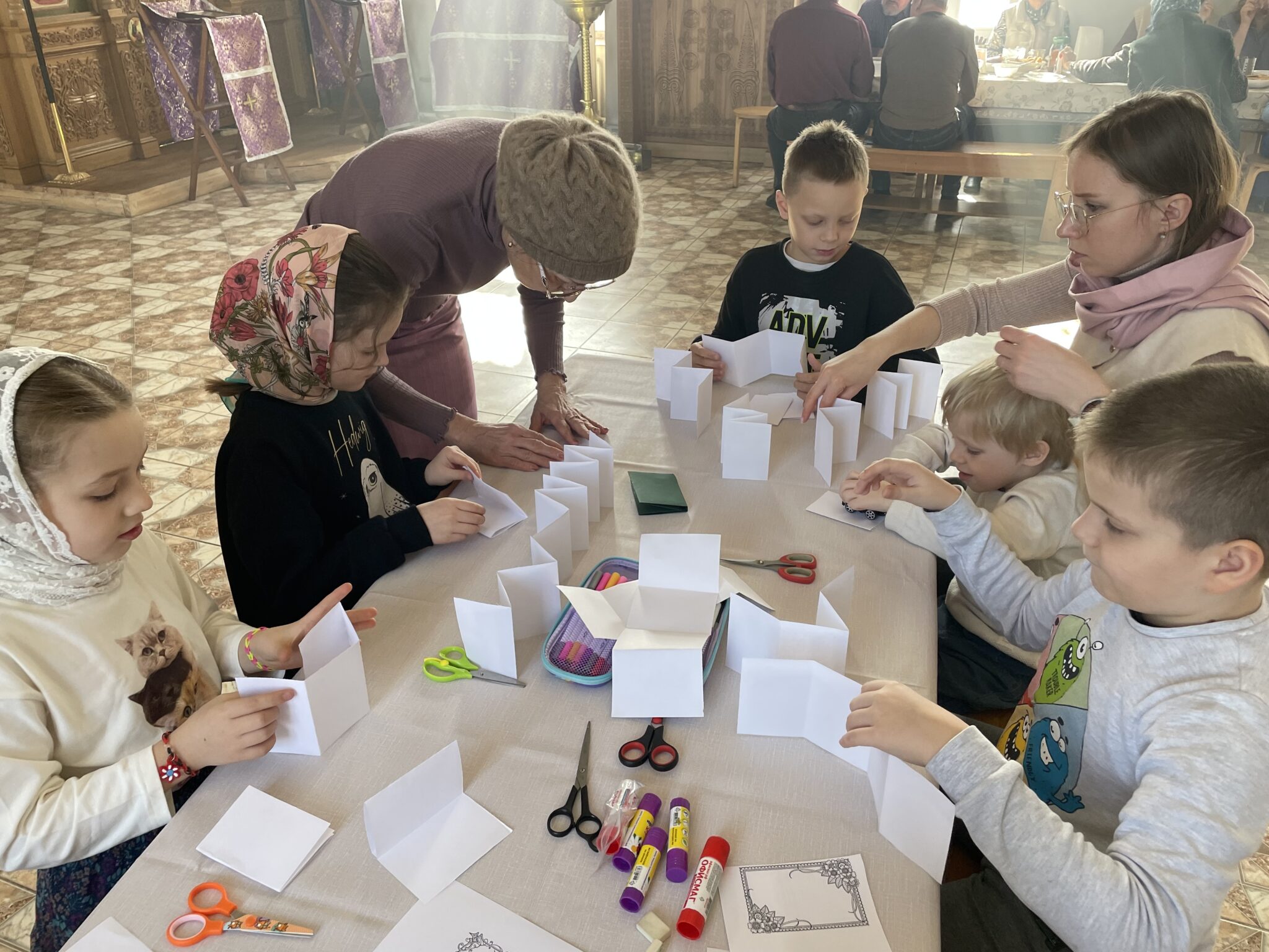 На второй половине занятия девочки и мальчики своими руками сделали книжки-малышки, в которых будет информация о нашем Никольском храме в Озерецком, а также о церковных праздниках.